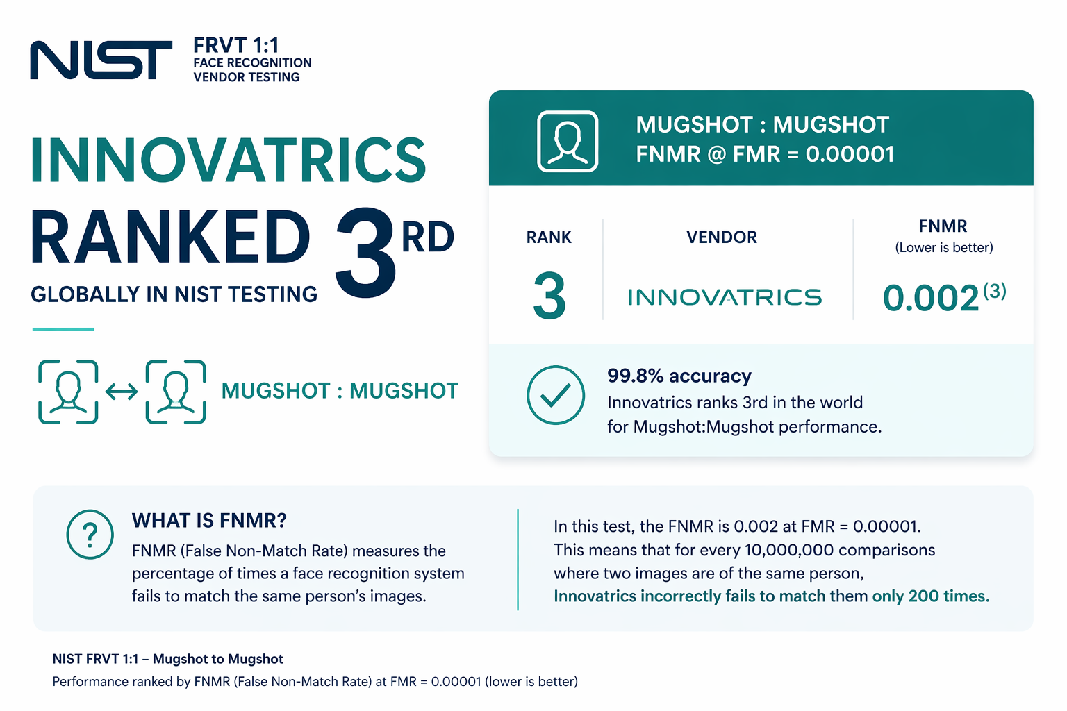 In NIST's FRTE 1:1 verification evaluation, Innovatrics ranks 3rd globally in the mugshot-to-mugshot benchmark as of its most recent submission in March 2025 — out of hundreds of algorithms submitted by vendors from around the world. The mugshot-to-mugshot scenario, in which a controlled photo is compared to another controlled photo at extremely low false match rates, is the closest available NIST test scenario to what I-9 verification actually requires: comparing a new hire's live selfie to the photo on their government-issued ID.